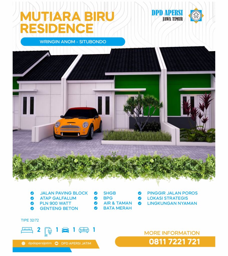 Dengan dukungan penuh dari DPD Apersi Jatim, Mutiara Biru Residence hadir sebagai solusi perumahan yang aman, legalitas terjamin, serta desain rumah yang modern dan fungsional. Fasilitas pendukung dan lingkungan yang tertata rapi menjadikan kawasan ini pilihan tepat untuk keluarga muda maupun investasi jangka panjang. Segera miliki rumah impian Anda di Mutiara Biru Residence – karena hunian nyaman dimulai dari pilihan yang tepat.